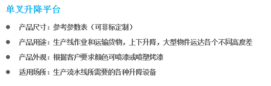 固定式液压升降台是一种升降稳定性好,适用范围广的货物举升设备主要用于生产流水线高度差之间货物运送;物料上线、下线;工件装配时调节工件高度;高处给料机送料;大型设备装配时部件举升;大型机床上料、下料;仓储装卸场所与叉车等搬运车辆配套进行货物快速装卸等。